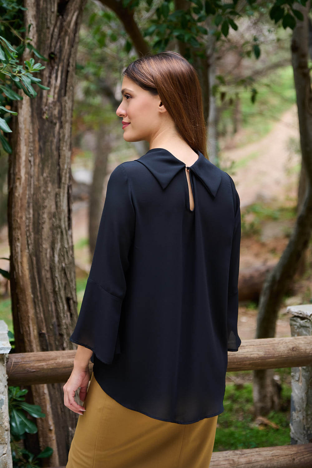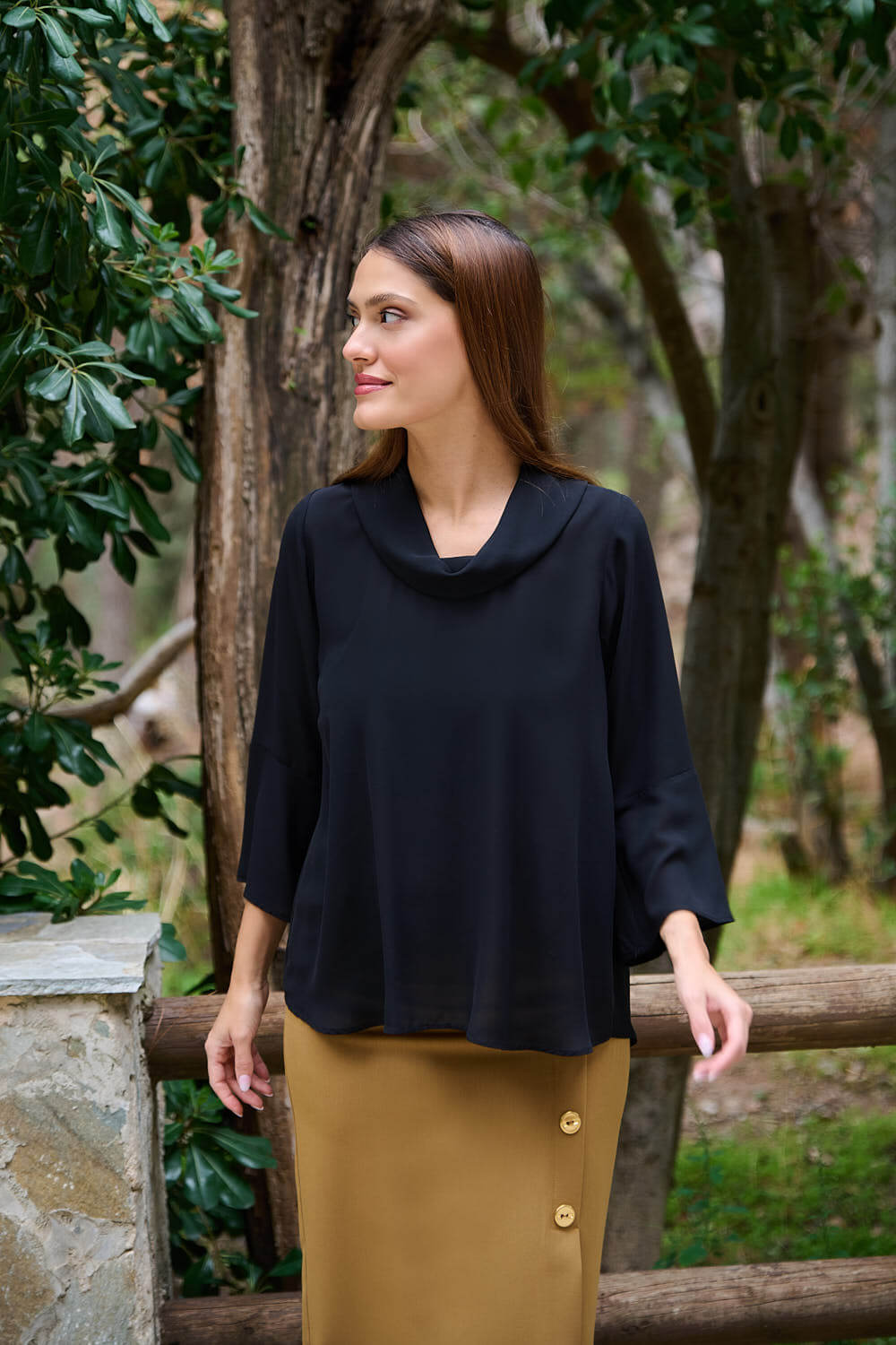 Μας αρέσει πολύ το άνετο, πολύ θηλυκό κόψιμό της. Ντραπέ ελαφρώς ανοιχτή λαιμόκοψη σε φαρδιά γραμμή και με τρουακάρ μανίκια με ελαφριά καμπάνα και βολάν. Μία πολύ θηλυκή μπλούζα. Στο πίσω μέρος είναι εμφανής ο γιακάς του, ο οποίος κλείνει με ένα κουμπί και η πλάτη πέφτει ριχτή, η οποία προσδίδει άνεση και αέρα κατά τις κινήσεις. Το μυστικό για κλασικά και διαχρονικά looks που πρέπει να έχεις στη ντουλάπα σου. Μπορείς να το φορέσεις σε όλες σου τις εμφανίσεις, από το πρωί στο γραφείο, στις καθημερινές σου εξόδους μέχρι και το βράδυ. Μία απλή αλλά πολύ ιδιαίτερη γυναικεία μπλούζα. Κράτα το στυλ σε καθημερινά επίπεδα! Είναι η ιδανική επιλογή για να είσαι πάντα κομψή και παντού! Αυτή η όμορφη μπλούζα παίζει το παιχνίδι της θηλυκότητας και το κερδίζει. Άνετη, κομψή, σε ύφασμα χωρίς να κολλάει επάνω σου. Σίγουρα έχει ουσιαστικό λόγο να βρίσκεται σε κάθε γκαρνταρόμπα.