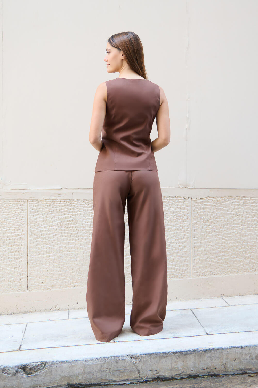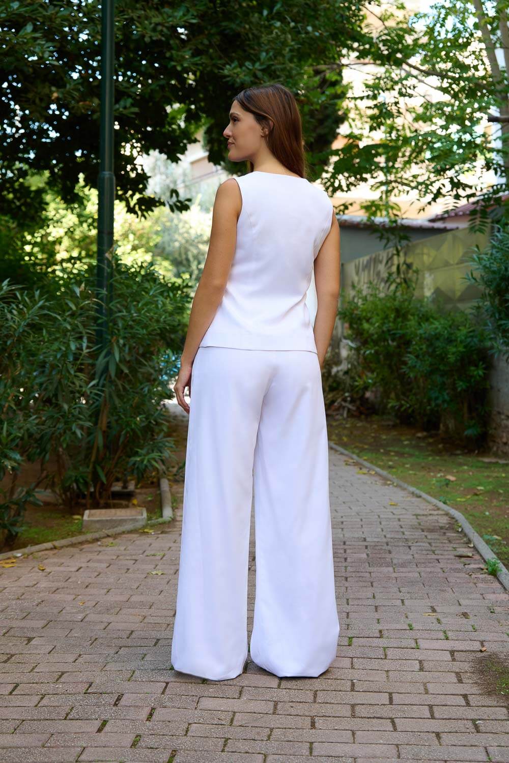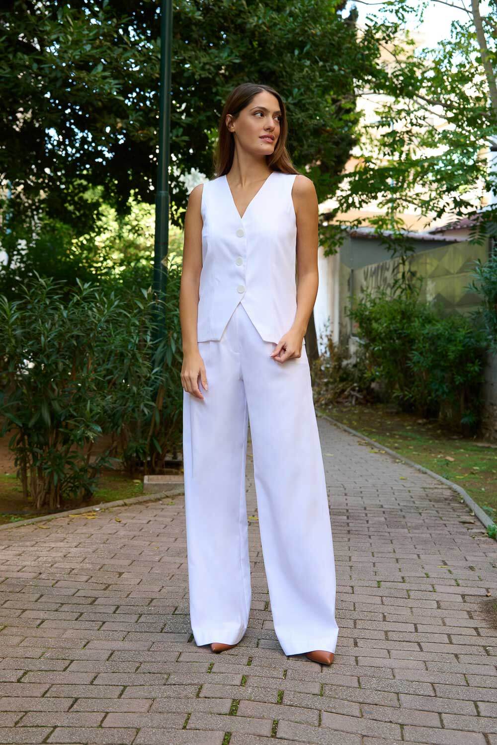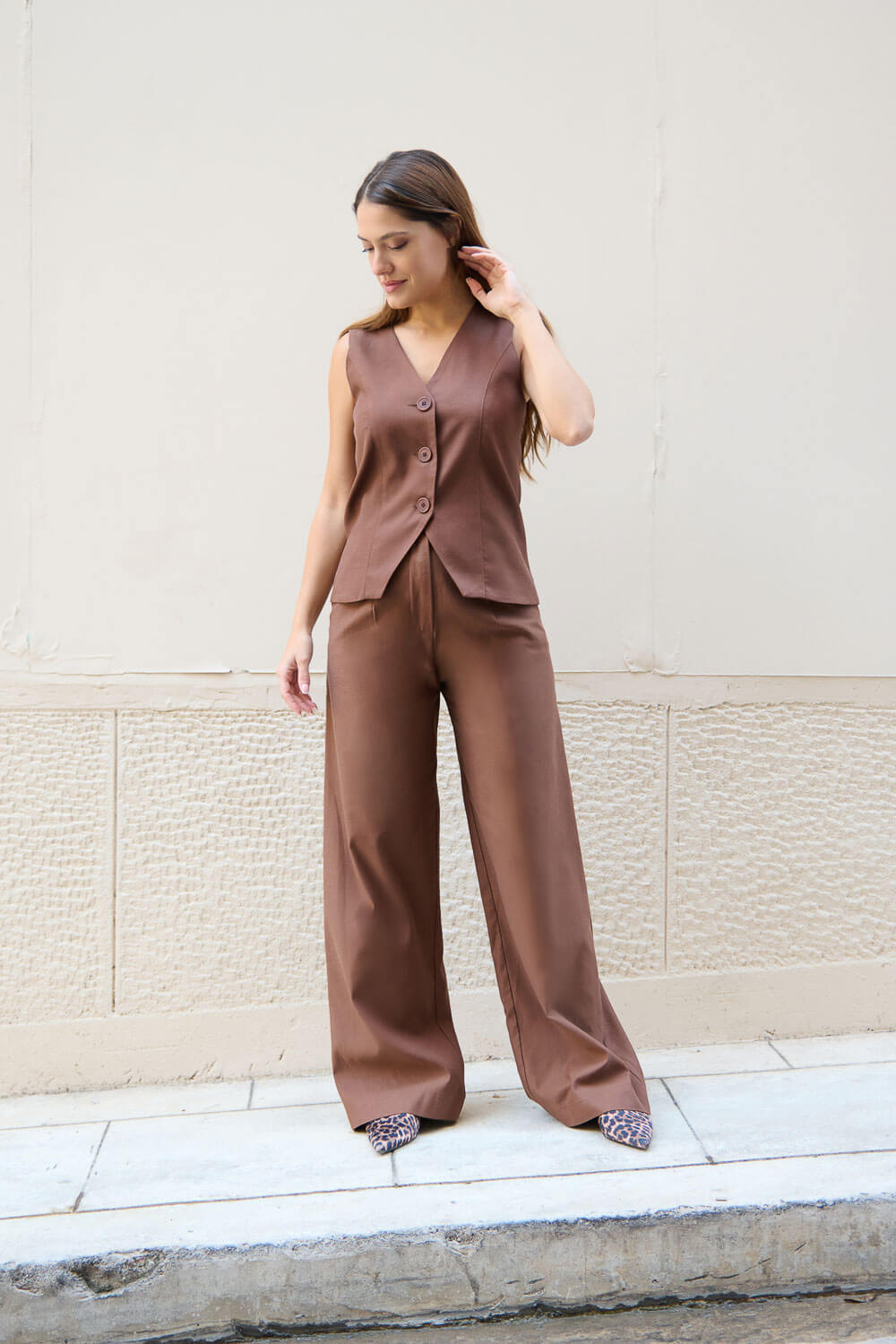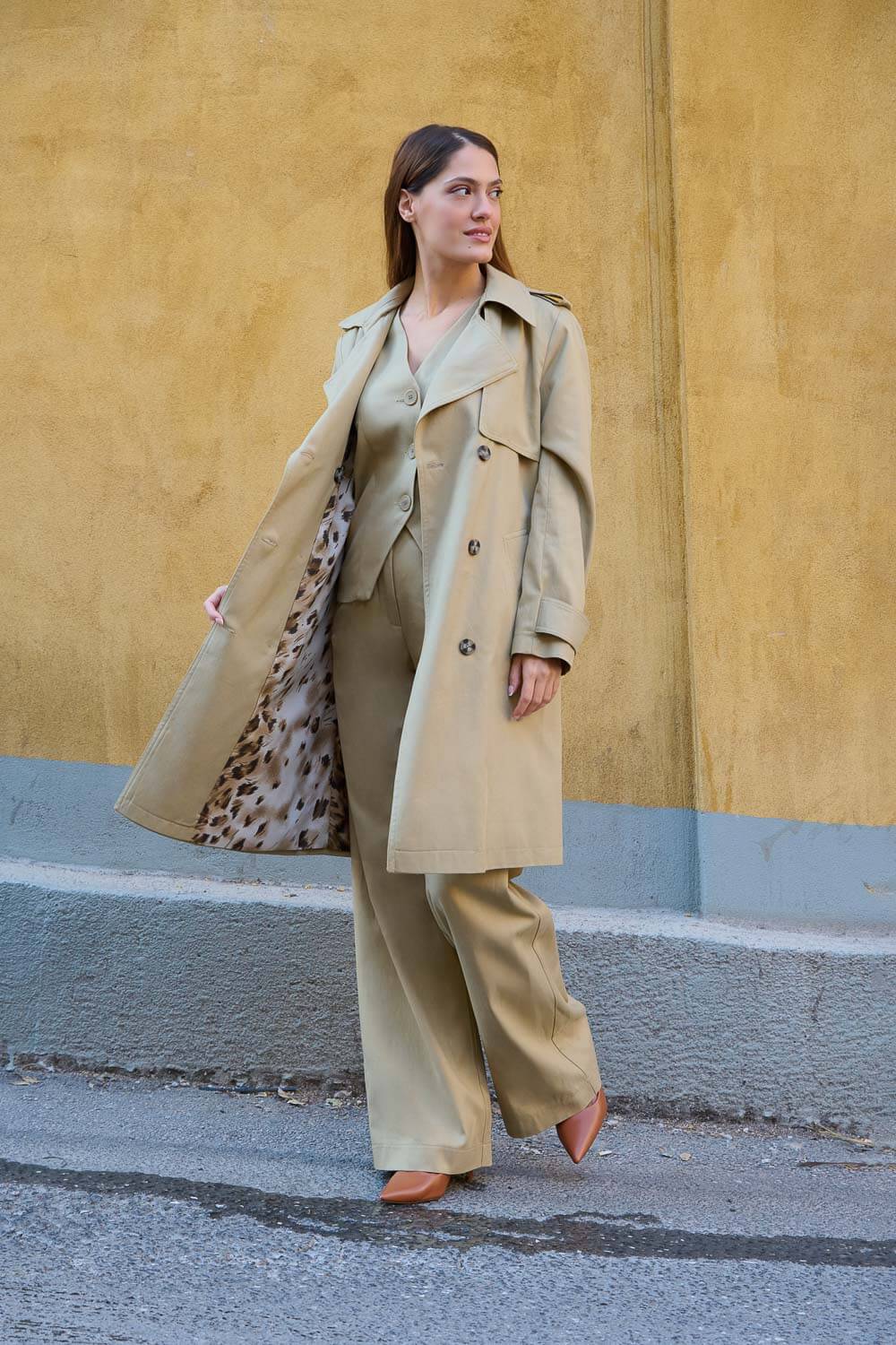 Υπάρχει και αντίστοιχο παντελόνι και καπαρτίνα στο ίδιο ύφασμα, για ολοκληρωμένο ντύσιμο, όπως επιτάσσει η μόδα για φέτος. Προσφέρει κομψότητα και στυλ, ενώ το παντελόνα αγκαλιάζει απαλά τη σιλουέτα και σε WIDE LEG γραμμή προσδίδοντας άνεση και ελευθερία κινήσεων.
