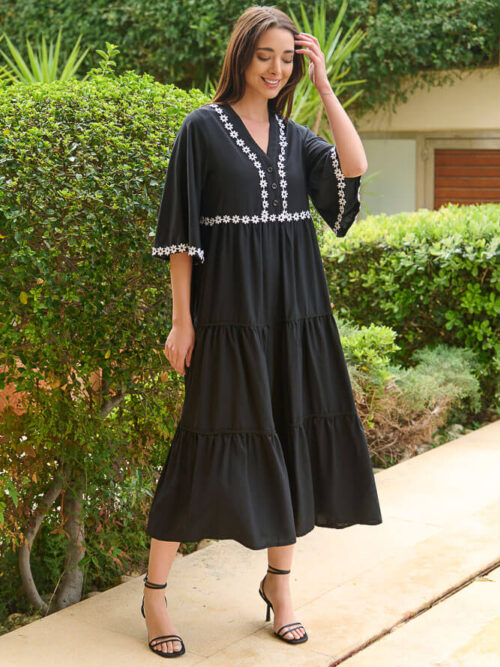 • ΦΟΡΕΜΑ ΣΑΤΕΝ ΜΑΞΙ ΣΕ ΜΠΕΖ ΜΑΥΡΟ ΓΕΩΜΕΤΡΙΚΑ ΣΧΕΔΙΑ ΚΑΙ ΚΑΜΠΑΝΑ ΜΑΝΙΚΙ