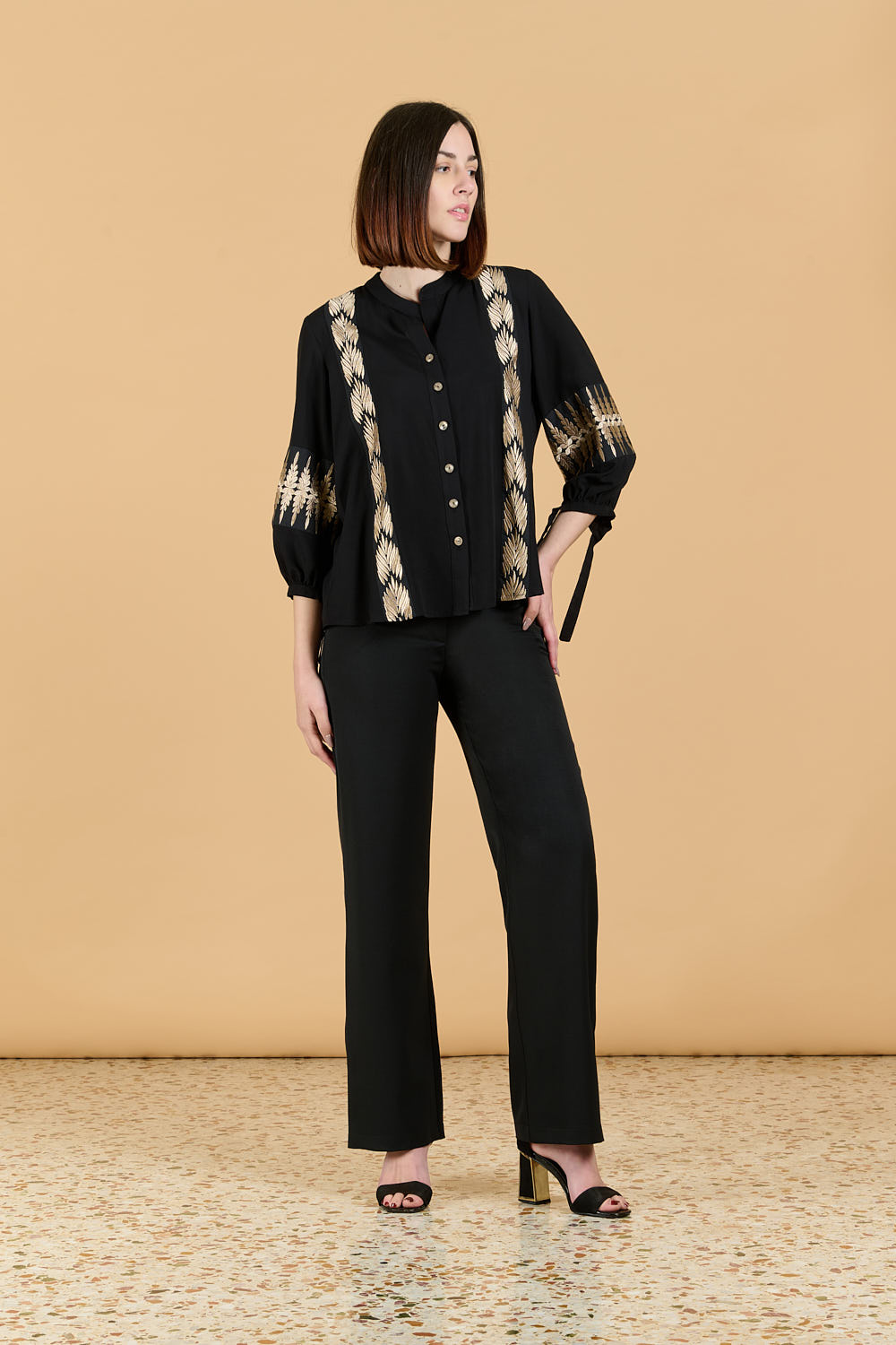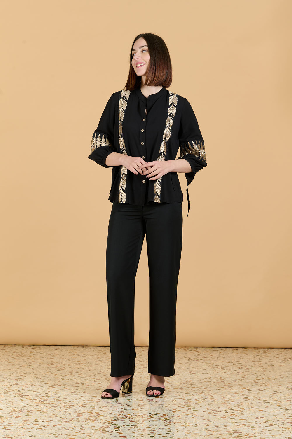 - Μάο γιακά στην πατιλέτα και κλείσιμο με μπεζ κουμπιά